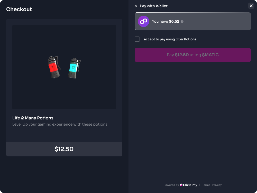 This innovative feature ensures that users remain within the game context throughout the payment process. Through our Elixir Native Wallet system, gamers have the flexibility to pay using the balance available in their wallet.